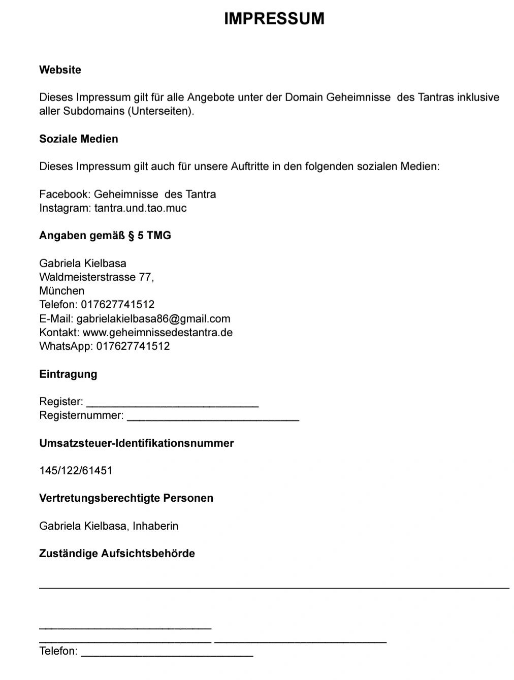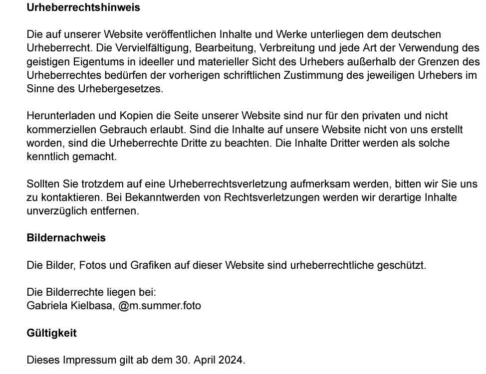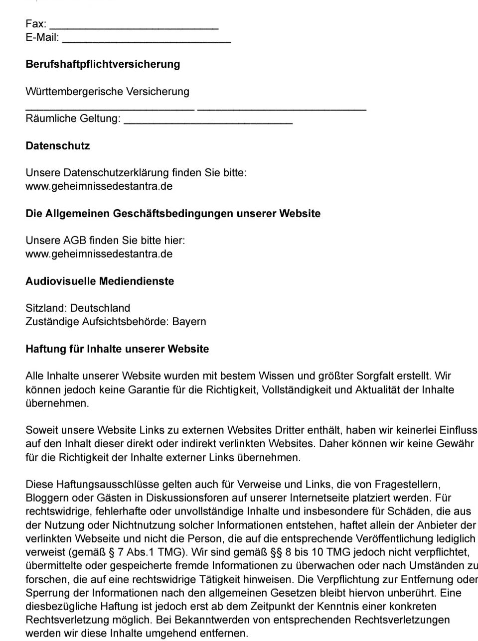 Allgemeine Geschäftsbedingungen von Gabriela Kielbasa www.geheimnissedestantra.de - im Folgenden: “Veranstalterin” genannt - Verbindliche Anmeldung Die Anmeldung für eine Massage, einen Workshop, ein Seminar, Tantra Urlaube oder ein Retreat ist rechtsverbindlich. Fälligkeit Für Tantra Urlaube, Retreats, Seminare und Workshops gilt: Nach Erhalt der Rechnung ist der halbe Rechnungsbetrag innerhalb von 14 Tagen, der weitere Rechnungsbetrag innerhalb von weiteren 14 Tagen fällig. Bei Erhalt der Rechnung binnen 14 Tagen vor Beginn einer Veranstaltung ist der gesamte Rechnungsbetrag 7 Tage vor Beginn der Veranstaltung fällig. Maßgeblich ist der Eingang des Betrages auf dem in der Rechnung genannten Konto. Wenn innerhalb der gennanten Fristen keine Zahlung eingegangen ist, wird vorbehalten, den Platz anderweitig zu vergeben. Rücktritt bei Tantra Urlauben Ein Rückritt ist NICHT möglich. Eine Rückerstattung erfolgt nicht. Auch wenn zum Zeitpunkt des Rücktritts erst eine Anzahlung geleistet ist, ist auch der restliche Rechnungsbetrag zu zahlen. Dasselbe gilt in dem Fall, dass ein Teilnehmer/ eine Teilnehmerin die Veranstaltung vorzeitig verlässt. Eine Erstattung erfolgt nicht. (Diese Bedingung ist u.a. deswegen erforderlich, da ein All-Inclusive-Urlaub angeboten wird und die Veranstalterin mit der Buchung des Veranstaltungsortes eine Vorleistung übernimmt, die allen Teilnehmenden eine sehr gute Qualität bieten soll.) Hinweis: Es gibt diverse Versicherungsunternehmen, die relativ günstig Rücktritts- Versicherungen für Seminare und Retreats anbieten. Bitte prüft, ob das für Euch eine Option ist. Rücktritt bei Veranstaltungen, Seminaren und Workshops mit Durchführung am Sitz des Studios der Veranstalterin Bei Stornierungen gibt es keine Erstattung. Dafür wird allerdings ein Gutschein in Höhe des gezahlten Betrages ausgestellt, der für sämtliche Leistungen des Studios genutzt werden kann. Dasselbe gilt, wenn ein Teilnehmer/ eine Teilnehmerin die Veranstaltung vorzeitig verlässt. Rücktritt bei einer gebuchten Massage Ein Rücktritt ist bis 24 Stunden vor dem vereinbarten Termin möglich. Bei einem Rücktritt innerhalb von 24 Stunden vor dem vereinbarten Termin sind 50% der Vergütung zu zahlen. Jeder Rücktritt bedarf der Textform. Jeder Rücktritt bedarf der Textform. Dieser kann ausschließlich über die EMailadresse gabrielakielbasa86@gmail.com gesendet werden. Die Nutzung anderer E-Mailadressen, von Telefon, SMS, Messengern oder mündliche Aussagen gelten nicht als gültige Absage. Etwas anderes gilt für Massagen. Diese können auf demselben Weg abgesagt werden, wie die Buchung erfolgt ist. Übertragung von Anmeldungen auf eine andere Person Für Workshops, Seminare, Retreats und Tantra Urlaube gilt: Eine Übertragung von Anmeldungen auf eine andere Person ist unter bestimmten Voraussetzungen möglich. Grundsätzlich sind Anmeldungen und Rechnungen immer personenbezogen. Wenn Du aber jemanden benennst, der/die die Zulassungsbedingungen erfüllt und dieser/diese per E-Mail das Einverständnis der Übernahme mitteilt, ist die Übertragung möglich. Bei Geschlechterungleichgewicht darf diese Person jedoch nur so ausgewählt werden, dass das Geschlechterverhältnis gleich bleibt. Die Veranstalterin achtet auf ein grundsätzlich gleiches Verhältnis. Wechsel der Veranstalterin Falls nicht anders angegeben, werden Workshops, Seminare, Retreats und Tantra Urlaube und alle anderen Veranstaltungen von Gabriela Kielbasa abgehalten. Im Fall einer schweren Krankheit behält sie sich vor, eine gleichermaßen qualifizierte Ersatzreferentin / Ersatzreferenten zu stellen. Absage eines Tantra Urlaubs/ einer Veranstaltung Die Veranstalterin behält sich das Recht vor, Veranstaltungen abzusagen (z.B. bei Nichtehelichen der Teilnehmerzahl). In diesem Fall werden alle erfolgten Zahlungen komplett rückerstattet. Preise Du erhälst nach Eingang der schriftlichen Anmeldung Deine Anmeldebestätigung und die Rechnung. Alle veröffentlichten Preise verstehen sich, sofern nicht anders ausgewiesen, inklusive der jeweils aktuell geltenden gesetzlichen MwSt. Ortstaxen im Fall von Tantra Urlauben sind nicht im Preis enthalten. Wichtige Grundlagen der Teilnahme (1) Die Teilnahme an allen Veranstaltungen ist freiwillig. Du trägst die volle Verantwortung für Dich und Deine Handlungen innerhalb und außerhalb der Veranstaltungen. (2) Es wird ausdrücklich darauf hingewiesen, dass die Veranstaltungen keine medizinischen oder psychotherapeutischen Behandlungen ersetzen können. Wer sich in einer Therapie befindet, muss rechtzeitig mit seiner Therapeutin / seinem Therapeuten klären, ob sie/er an der Veranstaltung teilnehmen kann. Die Veranstalterin ist hierüber sowie über früheren Krisensituationen hinzuweisen. (3) Erhebliche gesundheitliche Einschränkungen sind zeitnah per E-Mail mitzuteilen. (4) Einschränkungen zur Ernährung (z.B. Allergien, Intoleranzen usw.) sind möglichst spätestens 7 Tage vor Kursbeginn per E-Mail mitzuteilen. (5) Eine Teilnahme kann nur stattfinden, wenn keine sexuell übertragbaren Krankheiten vorhanden sind. Haftung von Teilnehmenden (1) Für von Dir verursachte Schäden kommst Du selbst auf und stellst die Veranstalterin, weitere Kursleiter und die Gastgeber an den Veranstaltungsorten von allen Haftungsansprüchen frei. Die Veranstalterin und die ihr helfenden Personen haften nur in Fällen des Vorsatzes oder der groben Fahrlässigkeit nach den gesetzlichen Bestimmungen. (2) Bei erkennbaren gesundheitlichen oder psychischen Problemen, bei denen eine Gefahr für Dich selbst oder andere nicht ausgeschlossen werden kann, behält sich die Veranstalterin jederzeit das Recht vor, Dich erforderlichenfalls von der Veranstaltung zu verweisen. Weitere Ansprüche, z.B. auf Rückerstattung von Zahlungen, sind ausgeschlossen. (3) Ein Teilnehmer / eine Teilnehmerin verhält sich vertragswidrig, wenn er / sie die Veranstaltung nachhaltig stört, oder wenn er / sie sich in erheblic